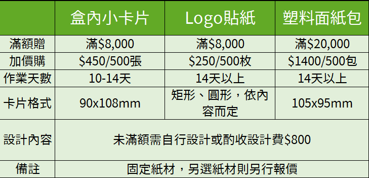 客製化項目內容 (提升質感的小步驟!!) 客製化卡片範例 2張名片大小 正反面(直式或橫式) 客製化貼紙範例 客製化大面積面紙範例 客製化表單填寫處 ※建議提前至少7工作天討論,若緊急請直接來電討論。 載入中…