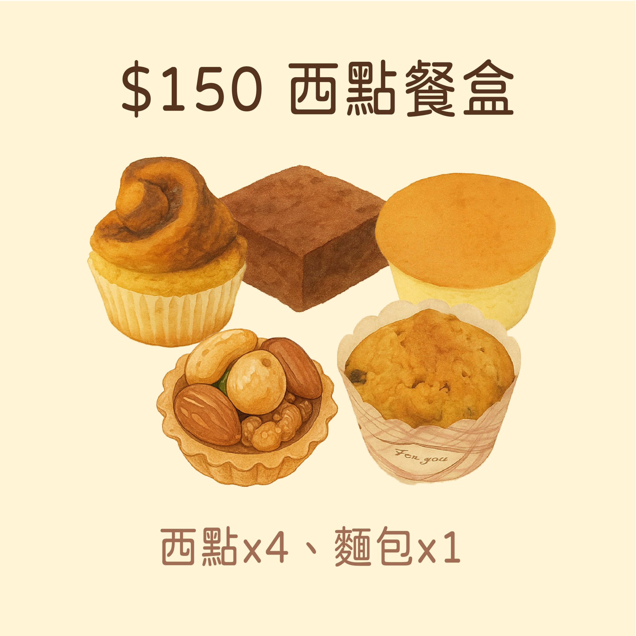 | 小西點1 | 茉莉花綠小磅蛋糕, 櫻花小磅蛋糕, 莓果小磅蛋糕, 伯爵茶小磅蛋糕, 可可戚風杯子, 莓果戚風杯子, 柳橙戚風杯子, 輕乳酪杯子蛋糕, 可可布朗尼 |