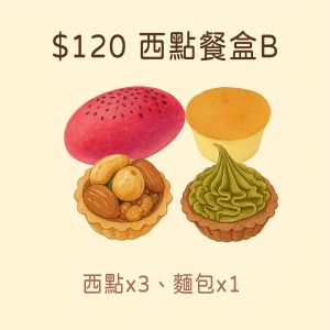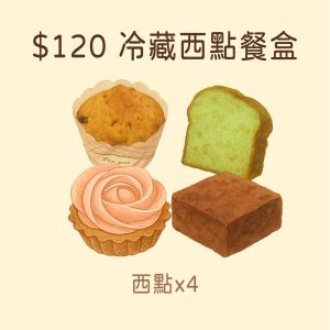 | 小西點2 | 茉莉花綠小磅蛋糕, 櫻花小磅蛋糕, 莓果小磅蛋糕, 伯爵茶小磅蛋糕, 可可戚風杯子, 莓果戚風杯子, 柳橙戚風杯子, 輕乳酪杯子蛋糕, 可可布朗尼 |
